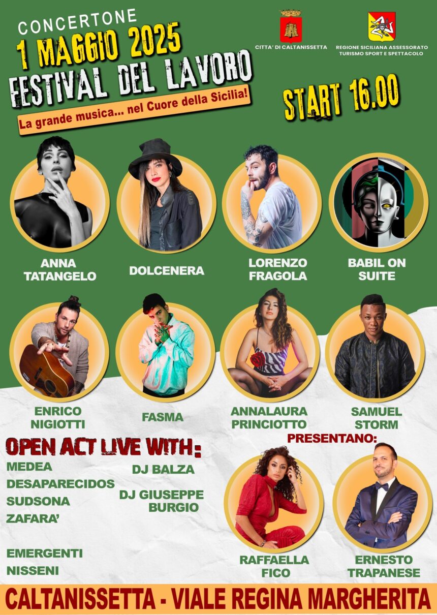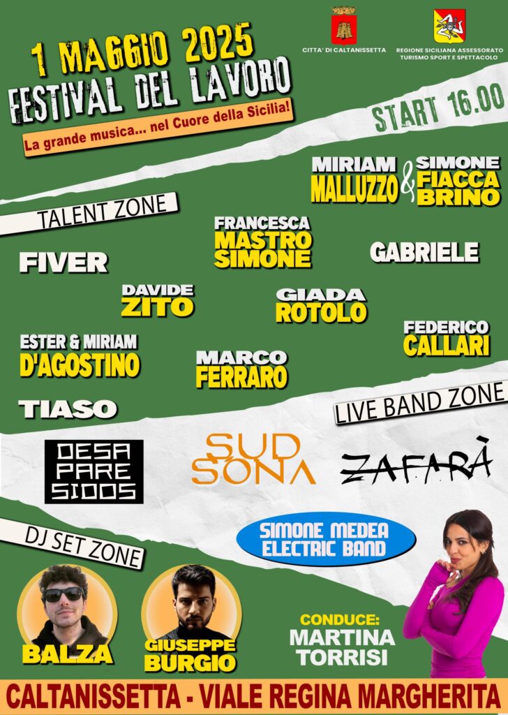 È tempo di musica il Primo Maggio a Caltanissetta. Dalle ore 16:00 il Comune di Caltanissetta e la Regione Sicilia hanno organizzato il “Festival del Lavoro – La grande musica nel Cuore della Sicilia”. Sarà un concerto gratuito nel quale tanti artisti sono pronti a esibirsi nel palco che sarà allestito in viale Regina Margherita.