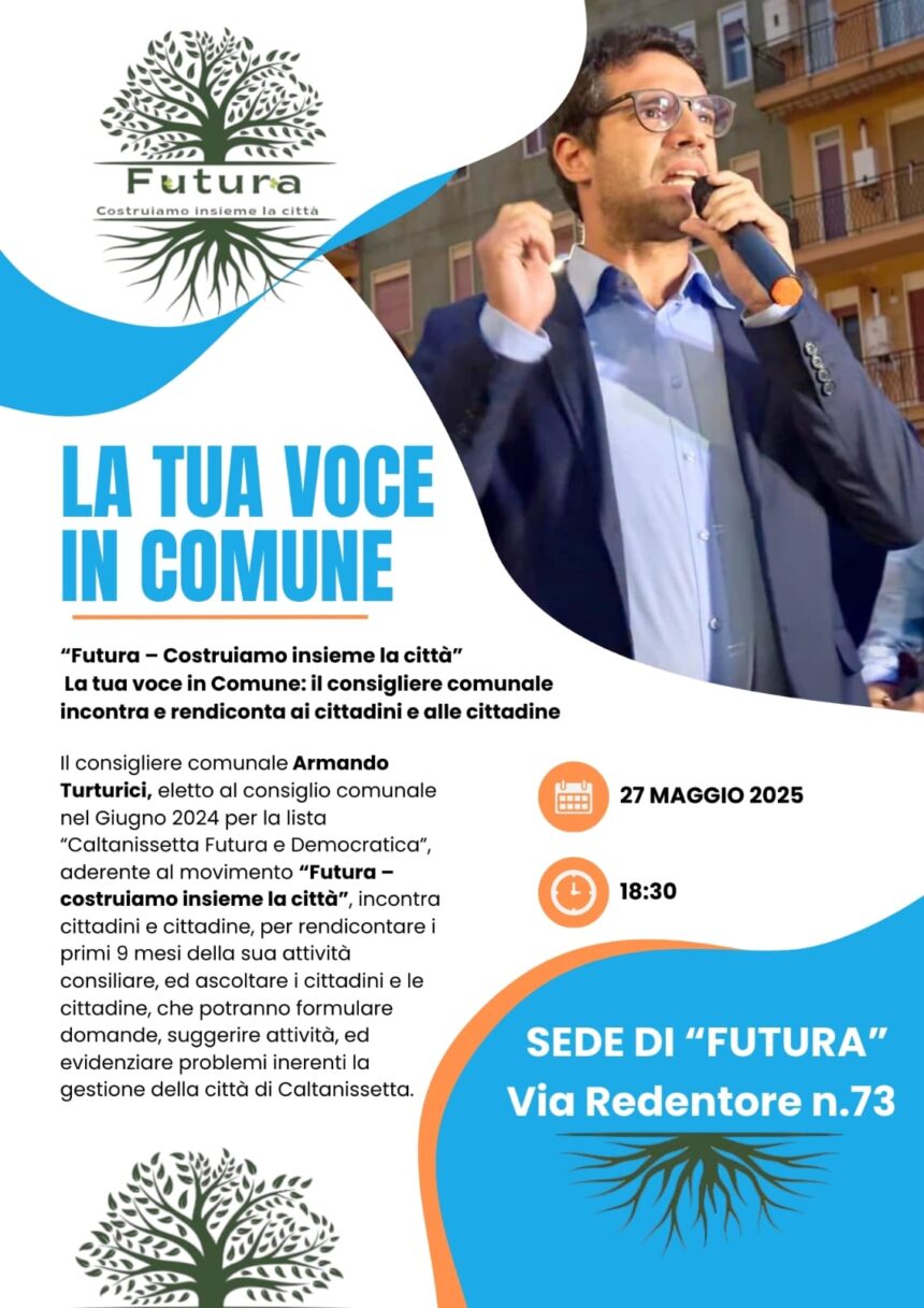 Durante l'incontro, il consigliere Turturici presenterà un rendiconto dei suoi primi nove mesi di attività consiliare. In particolare, sarà un momento per formulare domande, suggerire progetti e attività ed evidenziare problemi inerenti la città di Caltanissetta.