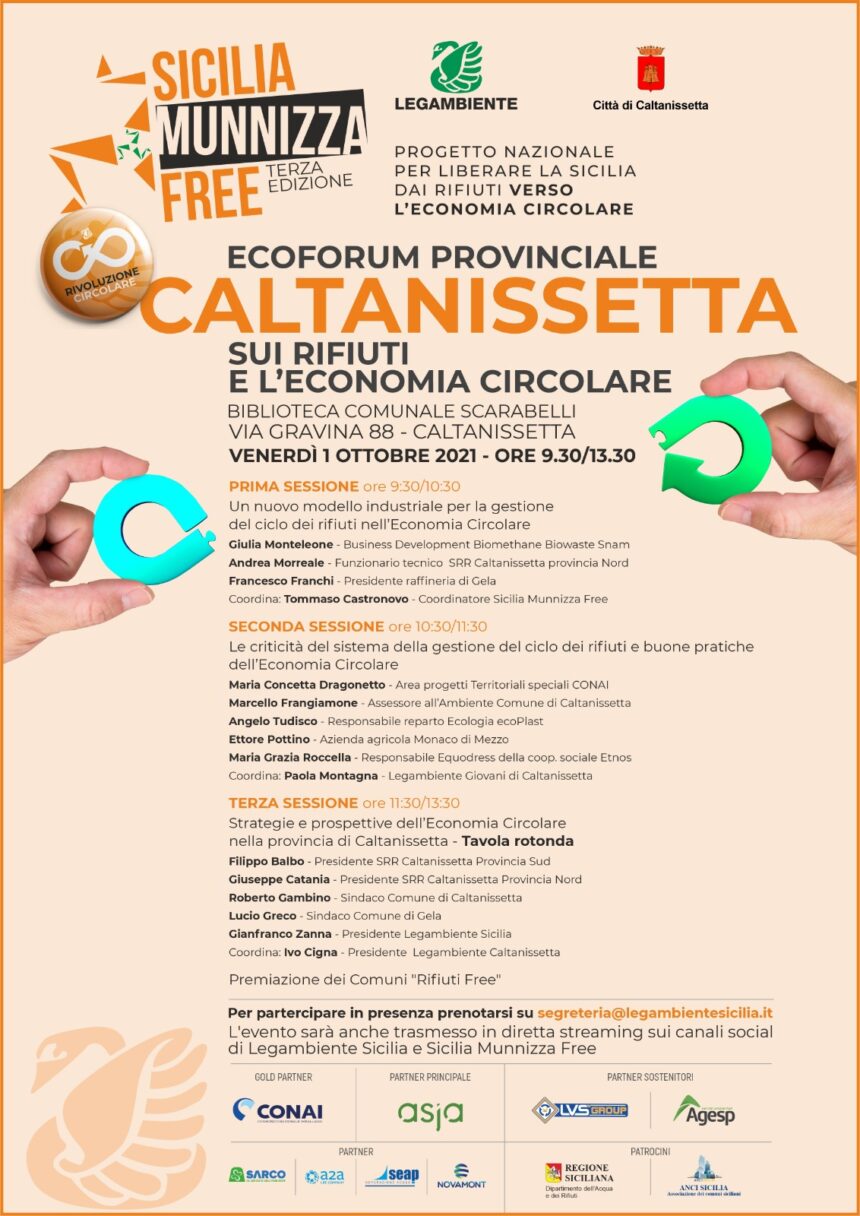 Nella prima sessione, confronto con esperti e realtà industriali, pubbliche e private, sul nuovo modello industriale per l’economia circolare. La seconda sessione sarà dedicata alle criticità nella gestione del ciclo dei rifiuti e le buone pratiche dell’economia circolare nella provincia di Caltanissetta. Nella terza sessione saranno affrontate, con i responsabili locali e regionali, le strategie e le prospettive dell’economia circolare. Sicilia Munnizza Free è patrocinato dal Dipartimento Regionale dei Rifiuti –Assessorato Regionale Energia e servizi di pubblica utilità -Regione Sicilia e dall’Anci Sicilia. Il progetto è sostenuto da: CONAI, ASJA, LVS GROUP, AGESP, SARCO, A2A, SEAP e NOVAMONT