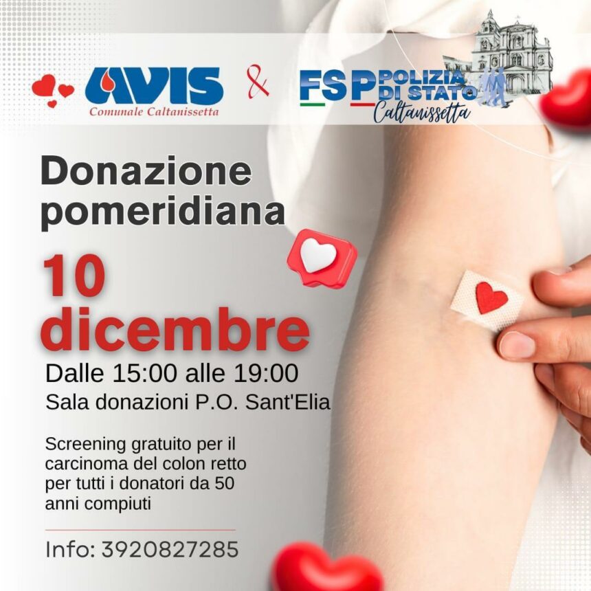 FSP Polizia e AVIS Caltanissetta uniti per la donazione del sangue: un gesto che salva vite La Federazione Sindacale di Polizia (FSP), in collaborazione con AVIS di Caltanissetta, rinnova il suo impegno nella promozione della donazione del sangue, un atto di solidarietà che può davvero fare la differenza per chi è in difficoltà. Invitiamo tutti i colleghi e i cittadini a unirsi a questa nobile causa: ogni donazione è un contributo prezioso per salvare vite e offrire speranza. Inoltre, donare è anche un’opportunità per la prevenzione: tutti i donatori di età compresa tra i 50 e i 69 anni potranno usufruire gratuitamente dello screening per il carcinoma del colon retto, un importante passo verso la tutela della propria salute. Accogliere questo invito non è solo un gesto di altruismo, ma un impegno concreto per il benessere della nostra comunità. Donare sangue è un atto che conta. Vi aspettiamo il 10 dicembre dalle 15:00 alle 19:00 presso la Sala Donazione P.O. Sant’Elia. Info sede Avis tel. 3920827285