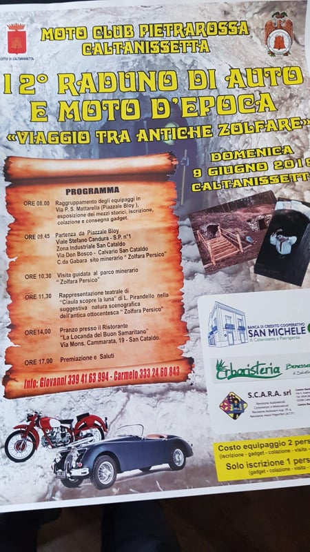 Appuntamento domenica 9 giugno con il 12° "Raduno di auto e moto d'epoca" organizzato dal Moto Club Pietrarossa di Caltanissetta. Il programma prevede il raggruppamento dei partecipanti alle 8 al piazzale Bloy per l'esposizione dei mezzi storici, l'iscrizione, colazione e consegna dei gadget. Alle 9.45 si partirà alla volta di San Cataldo per poi visitare il parco minerario “Zolfara Persico” dove sarà rappresentato “Cialua scopre la luna” di Pirandello. La premiazione è fissata per le ore 17.