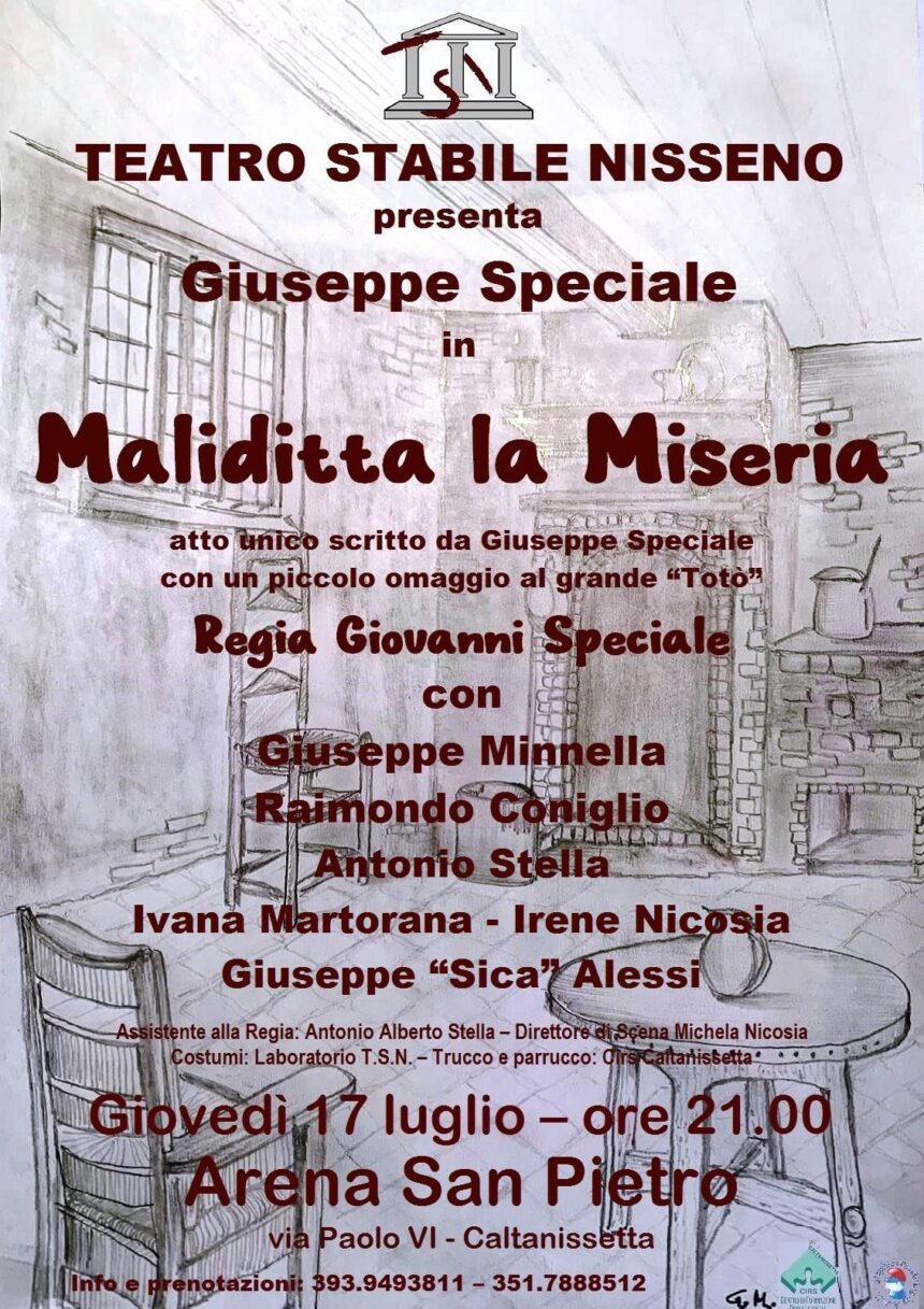 Dopo la Compagnia Cepros di Corleone che giovedì scorso ha aperto la Rassegna, stavolta ad andare in scena sarà proprio il Teatro Stabile Nisseno che porta al debutto la nuoca Commedia da titolo “Maliditta la miseria”, atto unico di Giuseppe Speciale con un piccolo omaggio al grande Totò.