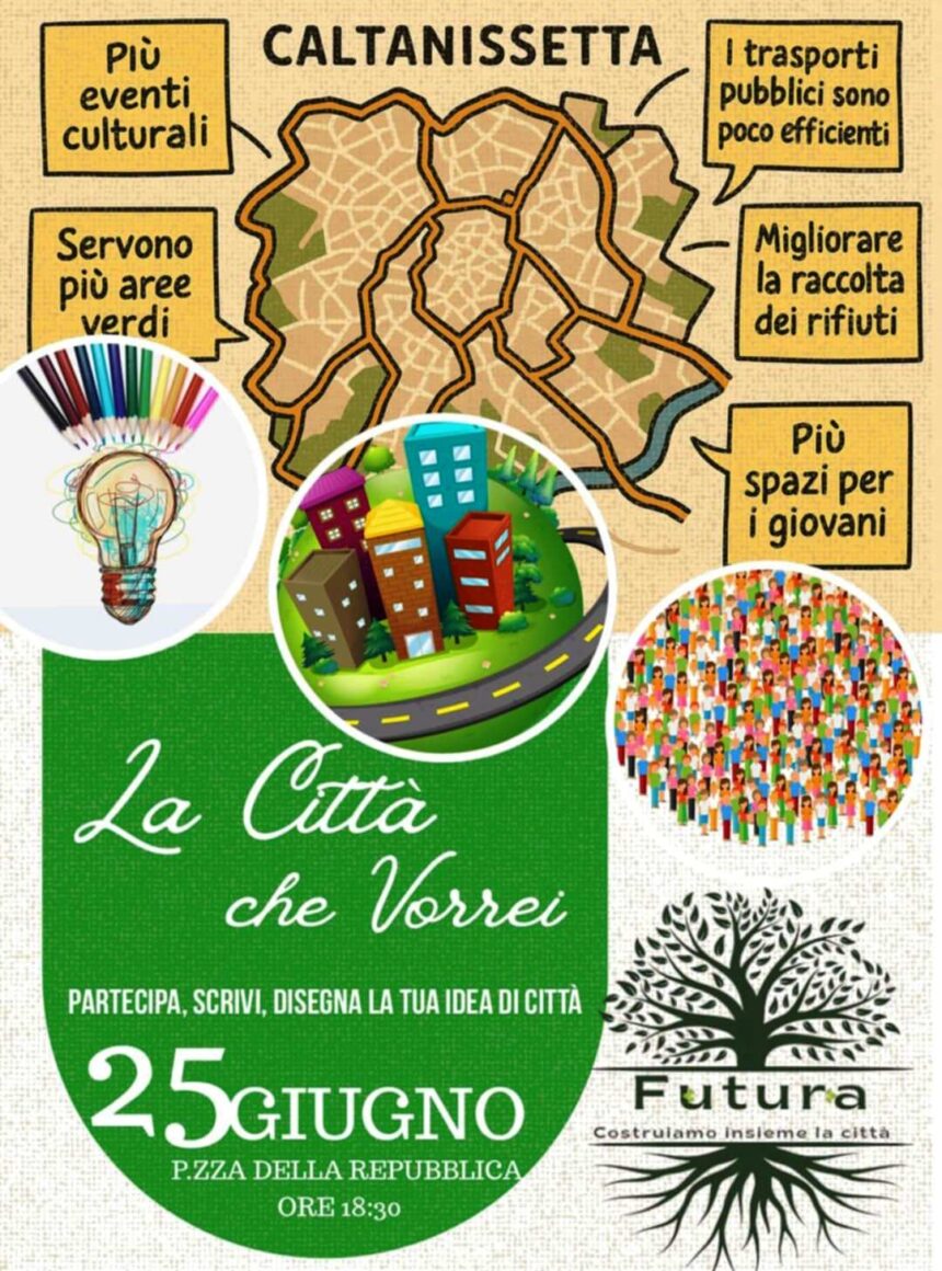 Il gruppo politico “Futura – costruiamo insieme la Città”, nell'ottica di prepararsi al governo della città, invita tutti i cittadini a partecipare al primo incontro pubblico “La Città che Vorrei”, che si terrà martedì 25 giugno alle ore 18:30 in Piazza della Repubblica, a Caltanissetta, primo di una serie di incontri itineranti per costruire insieme il futuro di Caltanissetta.