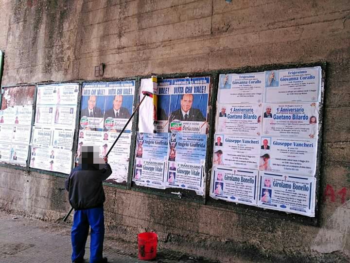 In guerra e in amore tutto è lecito, dice il detto. In politica no però, specie in campagna elettorale. Non è passata inosservata questa mattina la presenza, in vista delle Europee, dei manifesti elettorali di Silvio Berlusconi in tutta la città. Ma chi ha attaccato i manifesti per Forza Italia, probabilmente ignorando le regole, è arrivato ad invadere anche gli spazi riservati ai necrologi. Probabile che anche gli stessi dirigenti del partito ignoravano quanto accaduto. La foto ci è stata inviata da Alberto Morelli. "Questa mattina passando sotto il ponte di San Michele, verso via Sallemi -racconta il fotografo – mi sono accorto della presenza dei manifesti di Silvio Berlusconi che coprivano i necrologi. Questo accadeva intorno alle 9, dopo un'ora erano ancora lì". E sui social non sono mancate le proteste di chi chiede, almeno, il rispetto per i morti.
