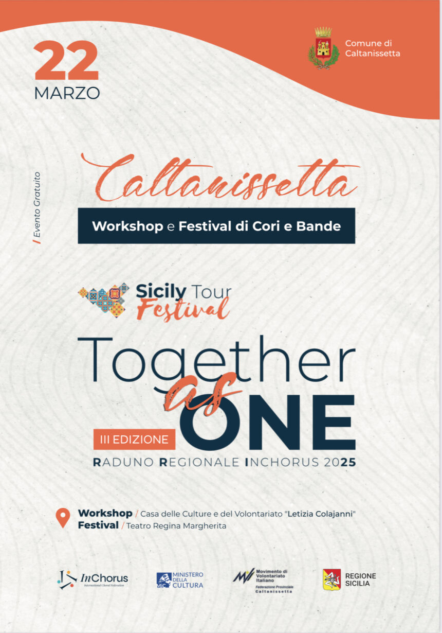 La città di Caltanissetta ospiterà il prossimo 22 marzo la terza edizione di Together as One, un evento unico ideato da InChorus Federation che celebra la musica corale e strumentale con una giornata ricca di workshop formativi gratuiti e un coinvolgente festival corale e bandistico.