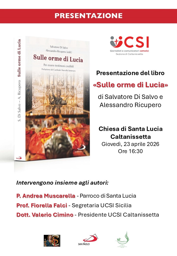 di Papa Francesco: «si riflette il mistero di un Dio che fa sempre il primo passo», sottolineando come la peregrinatio diventi segno concreto della vicinanza di Dio. Il volume, afferma il Cardinale, è «una proposta per essere tutti noi oggi uomini e donne del primo passo, figli e figlie di un Dio che si fa incontro», in una prospettiva che promuove la cultura dell’incontro, tanto cara al magistero di Papa Francesco. Gli autori mettono inoltre in luce la forza della testimonianza delle martiri siciliane Lucia e Agata, «esempi di libertà, bellezza e luce», capaci ancora oggi di parlare al cuore delle comunità. Il libro si propone così come uno strumento per comunicare «la bellezza e l’attualità del messaggio di Lucia», invitando a gesti concreti di carità, accoglienza e fraternità, fino a contribuire alla costruzione di quella “civiltà dell’amore”. Alla presentazione interverranno, insieme agli autori: Padre Andrea Muscarella, Parroco della Chiesa di Santa Lucia, Prof.ssa Fiorella Falci, Segretaria UCSI Sicilia, Dott. Valerio Cimino, Presidente UCSI Caltanissetta. L’evento è aperto al pubblico e si rivolge a fedeli, studiosi, operatori della comunicazione e a tutti coloro che desiderano approfondire il messaggio senza tempo di Santa Lucia, oggi più che mai attuale nel promuovere dignità della persona, armonia delle relazioni e bene comune.