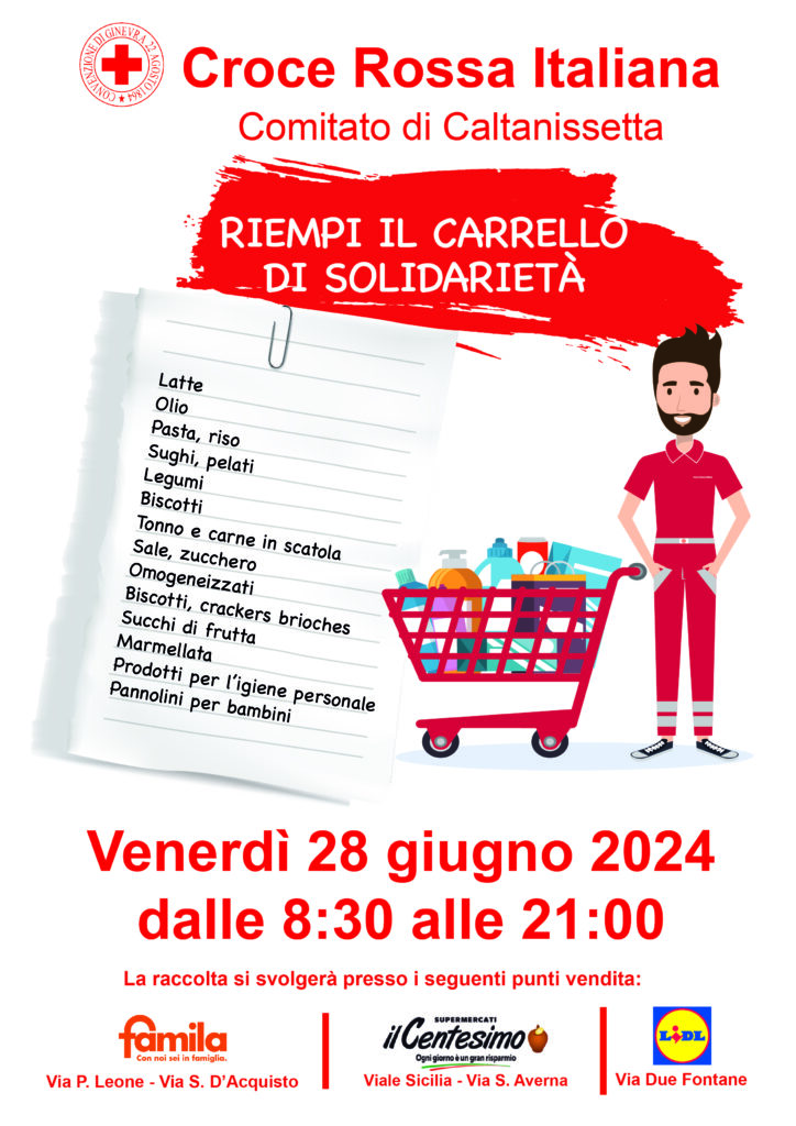 Per tutta la giornata di venerdì 28 giugno 2024, i volontari della Croce Rossa Italiana di Caltanissetta allestiranno un punto di raccolta di alimenti presso i supermercati presenti sul territorio che hanno aderito all’iniziativa e raccoglieranno i prodotti alimentari di tutti coloro che vorranno partecipare attenendosi all’elenco fornito all’ingresso del supermercato. La Croce Rossa di Caltanissetta invita tutti a partecipare all’iniziativa, perché anche fare la spesa e donarla a chi è meno fortunato di noi, rappresenta un grande gesto di generosità. I supermercati interessati sono Famila di Via Salvo D’acquisto e Via Pietro Leone, Centesimo di Corso Sicilia e Zona Industriale, Lidl di Via due Fontane. Cordiali Saluti