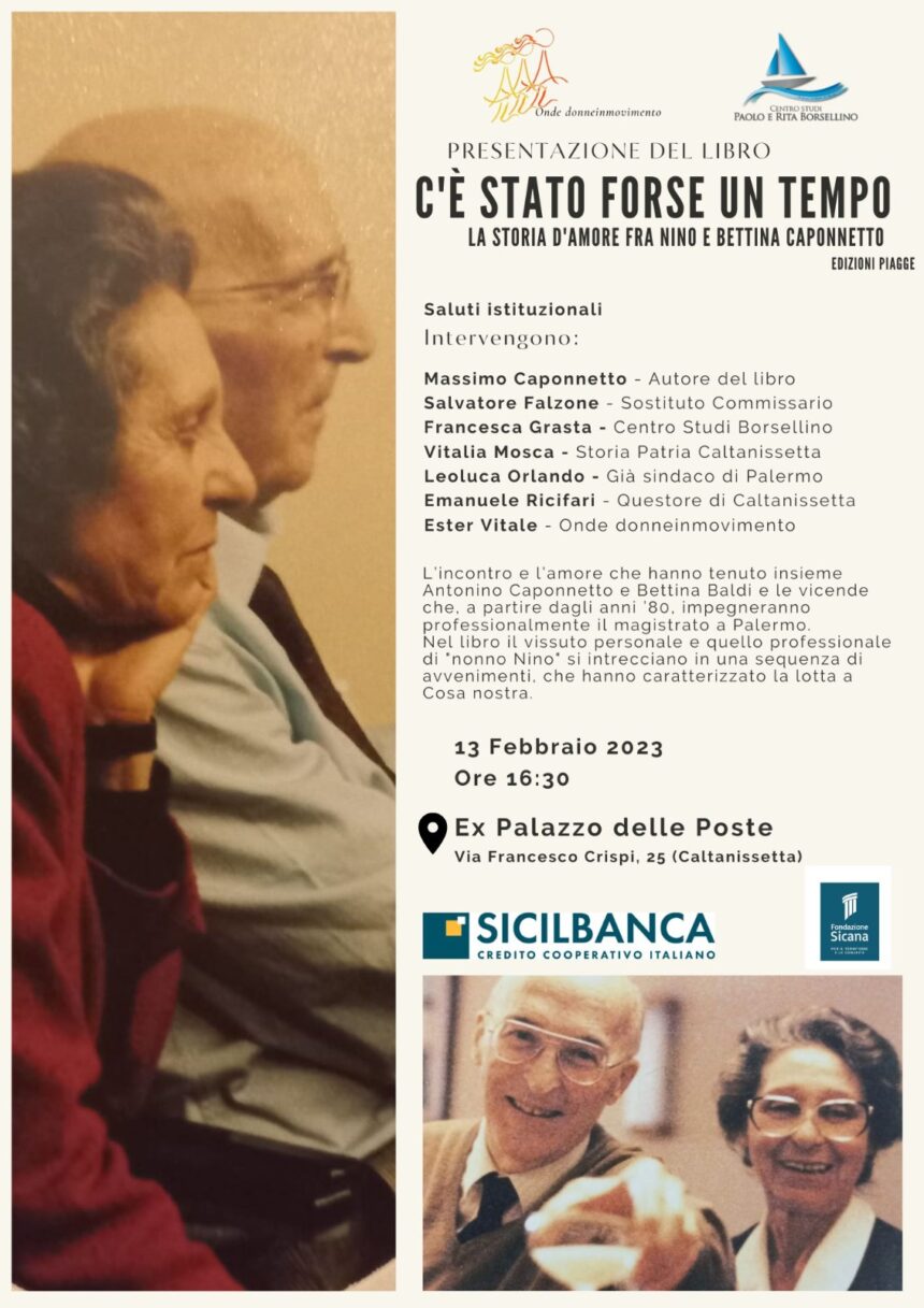 Le associazioni Onde donneinmovimento di Caltanissetta e il Centro Studi Paolo e Rita Borsellino di Palermo hanno organizzato per il 13 febbraio alle ore 16:30 , nella prestigiosa cornice della SIcilbanca, la presentazione del libro "C'è stato forse un tempo" di Massimo Caponnetto, figlio del giudice Antonino Caponnetto, nato a Caltanissetta e Consigliere Istruttore a Palermo dal 1983 al 1987, coordinatore del pool antimafia negli anni di Falcone e Borsellino.