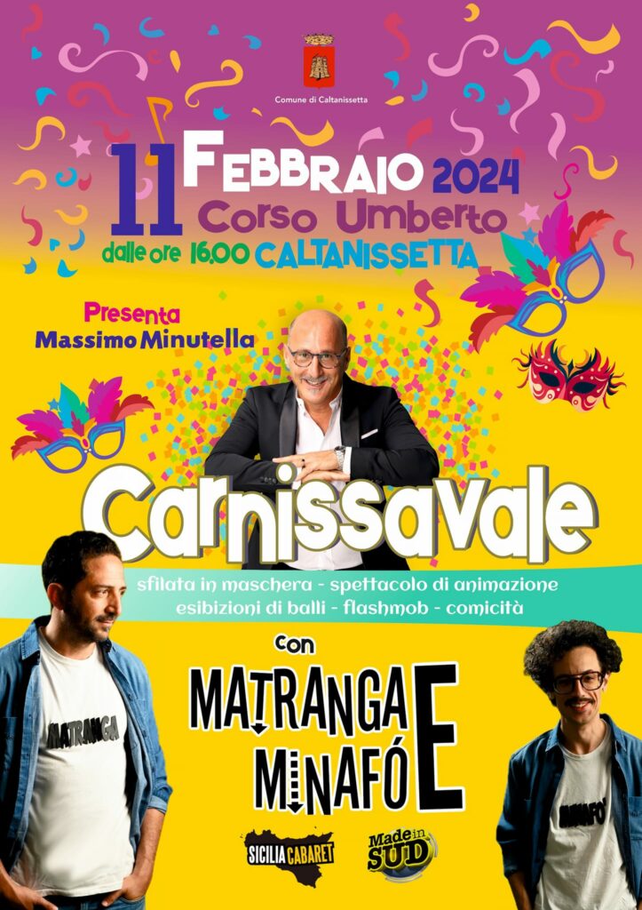 “11 Febbraio, Corso Umberto, ore 16.00. Un pomeriggio tra animazione, balli e maschere in compagnia del duo comico Matranga e Minafò. Conduce Massimo Minutella. Vi aspettiamo!” Ad annunciare l'evento sulla sua pagina facebook il sindaco Roberto Gambino. In programma una sfilata in maschera, uno spettacolo di animazione, esibizioni di balli, flashmob e momenti di comicità. Ecco la locandina.