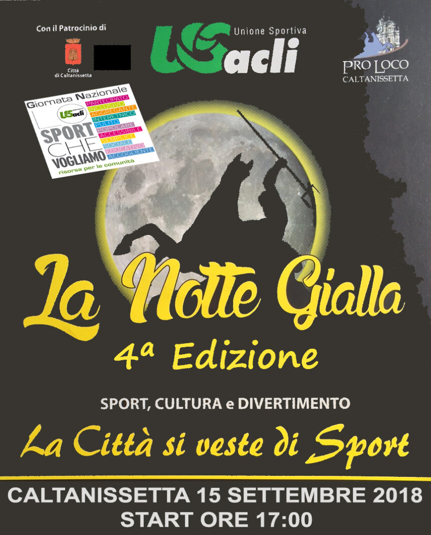È con grande soddisfazione che i dirigenti organizzatori US Acli della 4 edizione della Notte Gialla, programmata per il giorno 15 settembre p.v., comunicano che la manifestazione é stata quest'anno inserita nel contesto della prima edizione della Giornata Nazionale di Sport targata US Acli e denominata a livello Nazionale "Lo Sport che Vogliamo" la manifestazione si svolgera contemporaneamente in ben 36 province e 17 regioni, con 40 eventi programmati e oltre 42 discipline.