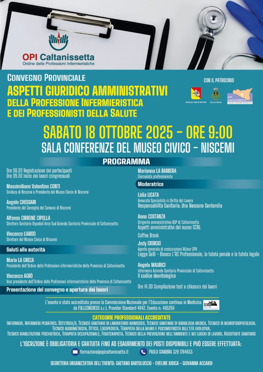 “Aspetti giuridico-amministrativi della professione infermieristica e dei professionisti della salute”: è il titolo del convegno che si terrà sabato 18 ottobre a Niscemi, nella Sala Conferenze del Museo Civico, in via Madonna 106.