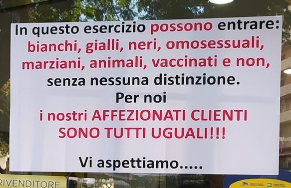 Il gestore del bar Rosalba a Palermo, in via Ammiraglio Rizzo, si schiera contro il green pass. Nella vetrina è stato esposto un cartello. Anche qui non verrà richiesto il green pass. Così si legge: "In questo esercizio possono entrare: bianchi, gialli, neri, omosessuali, marziani, animali, vaccinati e non senza nessuna distinzione. Per noi i nostri affezionati clienti sono tutti uguali. Vi aspettiamo". (ANSA).