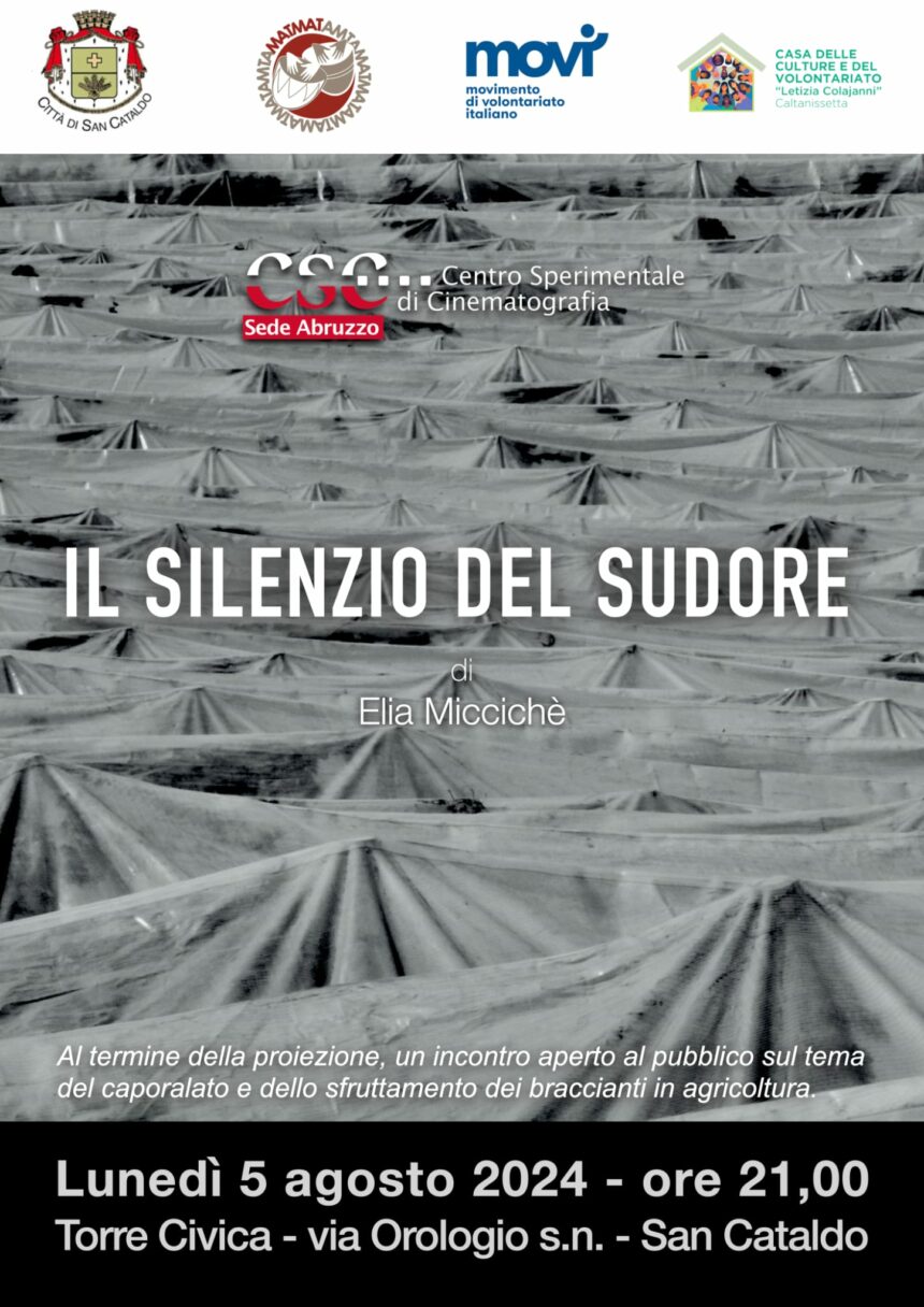 Lunedì 5 agosto alle ore 21.00, presso la Torre Civica in via Orologio a San Cataldo (CL), si terrà la proiezione pubblica del reportage “IL SILENZIO DEL SUDORE”, film prodotto dal Centro Sperimentale di Cinematografia – sede Abruzzo e diretto dal nisseno Elia Miccichè. L'evento – organizzato dal MO.V.I. (Movimento di Volontariato Italiano) e dalla Casa delle Culture e del Volontariato “L. Colajanni” di Caltanissetta in collaborazione con l'associazione “Mat Mat” di San Cataldo – rientra nel ciclo di proiezioni denominato “Cinema sotto le stelle all'Orologio”; la partecipazione è libera (fino ad esaurimento posti) e gratuita.