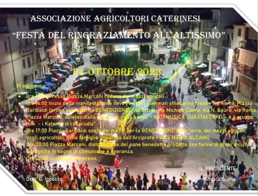 Si terrà a Santa Caterina, il 21 ottobre, la festa del ringraziamento dell'Altissimo organizzata dall'Associazione Agricoltori Caterinesi per ringraziare l'Altissimo per i doni della terra. "L'economia del nostro paese, Santa Caterina Villarmosa – scrivono gli organizzatori – è basata principalmente sul settore primario, sopratutto sull'agricoltura, di conseguenza è un evento molto sentito e importante. Inoltre dopo la sfilata dei mezzi agricoli nelle vie del paese, allietata dalla presenza della banda "Artemusica Guastaferro" e il gruppo folk I Katerini di Rasacudia, e la benedizione delle terre, dei mezzi agricoli, degli agricoltori e delle loro famiglie impartita dall'Arciprete Padre Marcio Alcamo, ci sarà una degustazione del pane con l'olio benedetto in Piazza Marconi. Le aziende agricole Angelo Stella e Lavande di Sicilia doneranno la farina di grani antichi per la realizzazione del pane. L'azienda agricola biologica Giovanni Seminatore donerà l'olio extravergine d'oliva biologico per condire il pane. La serata si concluderà con il sorteggio dei premi".