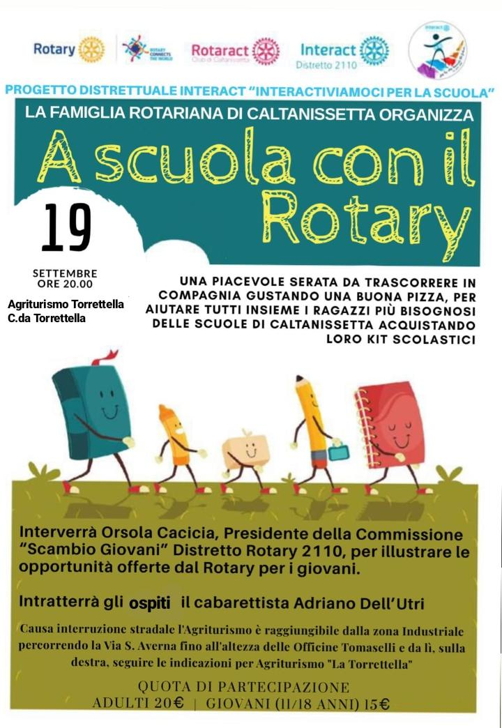 Si intitola A SCUOLA COL ROTARY la manifestazione che, da tre anni a questa parte, i Club Service di Caltanissetta Rotary, Rotaract e Interact organizzano per raccogliere fondi allo scopo di aiutare i ragazzi e le ragazze meno abbienti, che frequentano le scuole di Caltanissetta, ad acquistare libri e kit scolastici. Ed a dimostrazione che i nisseni sono molto sensibili quando si parla e si agisce in tema di solidarietà, all’appello lanciato dai Club hanno risposto in maniera massiccia non solo i rotariani, ma soprattutto tantissimi cittadini di ogni età e stato sociale, che si sono dati appuntamento questa sera in un noto locale di Caltanissetta per una piacevole serata, allietata peraltro dalla satira frizzante e sempre attuale dell’attore comico Adriano Dell’Utri.