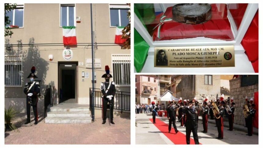 Si è proceduto successivamente all’inaugurazione della Caserma con il taglio del nastro da parte di S.E. Chiara Armenia, Prefetto di Caltanissetta e madrina della cerimonia, accompagnata dal Sig. Calogero ALAIMO, nipote del Car. M.O.V.M. Giuseppe PLADO MOSCA, che nell’occasione ha consegnato al Comandante della Legione la gavetta appartenuta allo zio, affinché venisse custodita nei locali della Stazione CC di Acquaviva Platani. In merito alla figura del Carabiniere M.O.V.M. Giuseppe PLADO MOSCA, nato ad Acquaviva Platani l’11 agosto del 1918 e deceduto il 23 dicembre 1942 in Russia, durante il secondo conflitto mondiale, si riporta di seguito la motivazione con la quale il 6 febbraio 1951 il Presidente della Repubblica conferì al militare la massima onorificenza “alla memoria”: