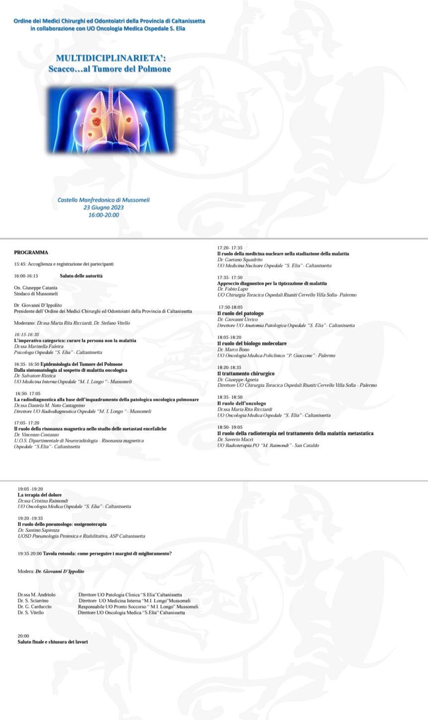 L'Ordine dei Medici Chirurghi ed Odontoiatri della Provincia di Caltanissetta organizza un incontro multidisciplinare sul tumore del polmone, in collaborazione con l'Unità Operativa di Oncologia Medica dell'Ospedale Sant'Elia del capoluogo nisseno. L'appuntamento con i medici si svolgerà a Mussomeli al Castello Manfredonico nel pomeriggio di venerdì 23 giugno.