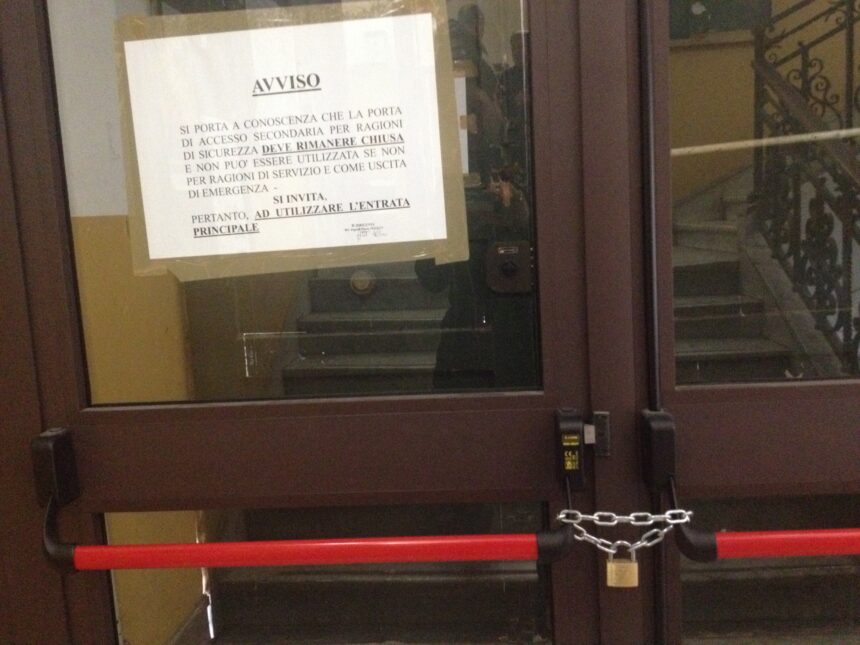 Strano, scandaloso, ma vero al Municipio di Caltanissetta. Per ragioni di sicurezza un’uscita di emergenza deve rimanere chiusa, e per questo motivo è stata bloccata con una catena ed un lucchetto, può però essere utilizzata come uscita di emergenza. Sembrerebbe una palese contraddizione o uno scherzo, eppure è quanto accaduto questa mattina al Comune di Caltanissetta. A denunciarlo – scattando anche una foto abbastanza eloquente – è il consigliere comunale di Forza Italia, Oscar Aiello, che dichiara: “Quello che sta accadendo è gravissimo! L’uscita di sicurezza è ermeticamente sigillata con catena e lucchetto, può però essere utilizzata come uscita di emergenza (così c’è scritto nell’avviso). Quindi in caso di improvvisa ed immediata evacuazione che si fa? Si va alla ricerca della chiave per aprire il lucchetto? E’ assurdo, valuterò domani se presentare un’Interrogazione consiliare per capire di chi è stata questa brillante idea. Nel frattempo chiederò che la catena venga immediatamente rimossa, con la sicurezza dei cittadini non si scherza”, aggiunge il consigliere comunale. Da alcune settimane accedere al Municipio di Caltanissetta non è più facile come prima. Una serie di restrizioni negli accessi sono state previste dopo l'aggressione subita dall'assessore alle Politiche sociali Giuseppe Firrone, che ha spinto l'Amministrazione comunale e il Comando di Polizia municipale a vietare l'ingresso a impiegati e utenti dal portone principale, mentre è possibile accedere dall'ingresso secondario, in particolare dai locali dell'Anagrafe. Ma certamente quello che ha denunciato Aiello oggi è davvero preoccupante. Il responsabile della sicurezza di Palazzo del Carmine – figura prevista dalla normativa – è a conoscenza di questo episodio oppure – come capitato altre volte in varie occasioni – al Comune ognuno fa ciò che vuole?
