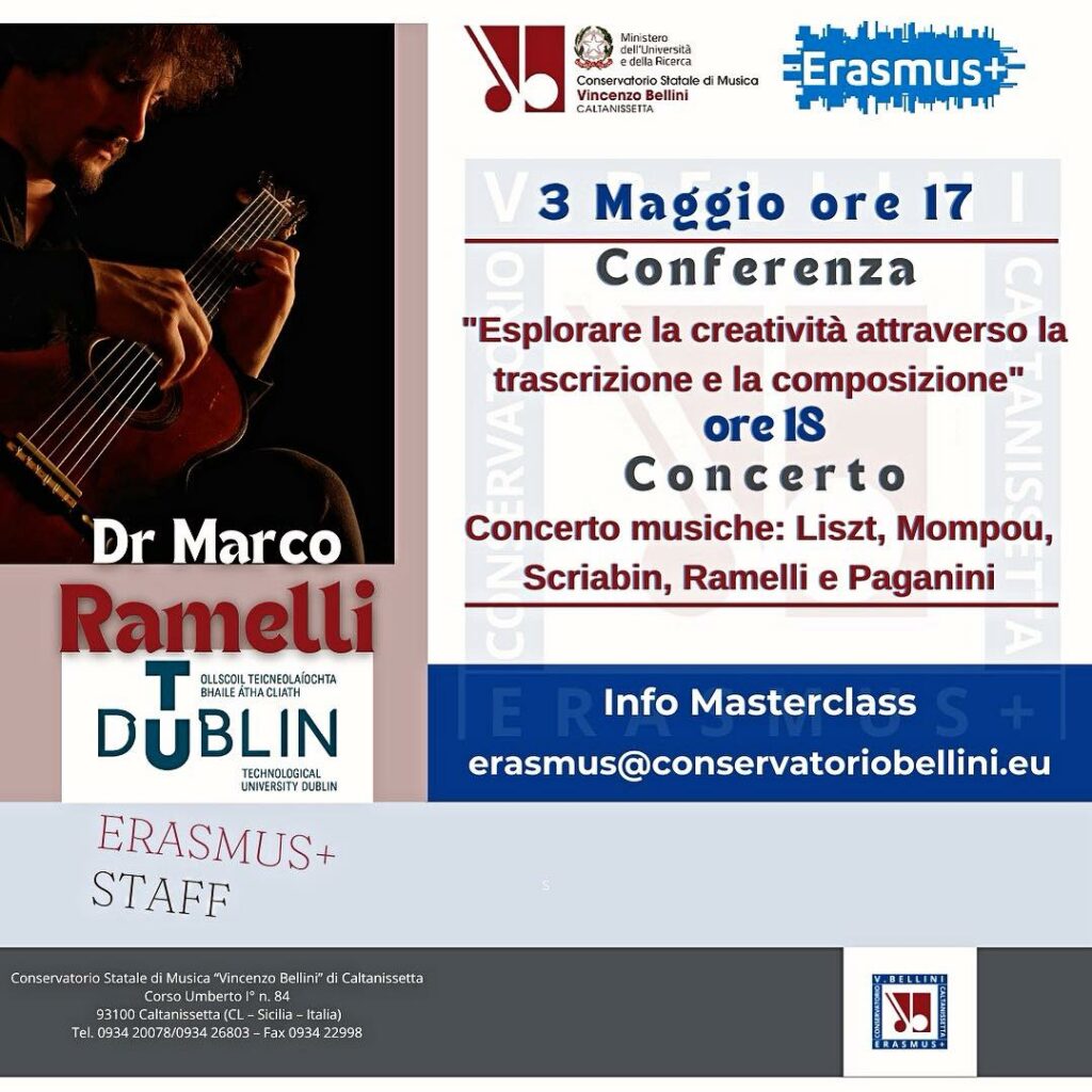 Tra le attività del dipartimento Erasmus+ del Conservatorio Vincenzo Bellini di Caltanissetta, nei giorni 2, 3 e 4 maggio si terrà nella sede dell’istituzione musicale nissena la masterclass del chitarrista e compositore Marco Ramelli, docente della TU University di Dublino.