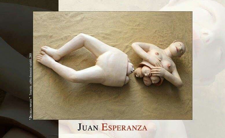 La presenza artistica di Juan Esperanza nel panorama dell’arte, si configura e si distingue in maniera particolare, dagli altri operatori dell’arte visiva, per la sua espressione creativa dal forte segno antropologico. La recente ricerca visiva dell’artista, prende le mosse dal rapporto con le cose della vita quotidiana del luogo in cui vive, recupera e utilizza oggetti e forme a volte in disuso, il cui prelievo diviene l’elemento da cui muoversi ed orientarsi, verso mete fantastiche e surreali. Grande manipolatore, gioca moltissimo con i materiali plastici intrisi e caricati di valori pittorici; sicuro protagonista nella pittura quanto nella scultura, si inoltra e attraversa il campo dell’installazione ambientale, trovando ulteriore campo d’indagine per la sua ricerca.