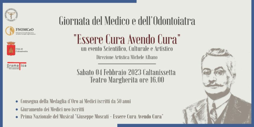 Il Teatro Regina Margherita di Caltanissetta è la location scelta per l'evento "Essere Cura Avendo Cura" organizzato dall'Ordine dei Medici Chirurghi e degli Odontoiatri della Provincia di Caltanissetta, con la Direzione Artistica di Michele Albano per celebrare la "Giornata del Medico e dell'Odontoiatra". Un appuntamento, quello di sabato 4 febbraio 2023 a partire dalle ore 16, che assume allo stesso tempo un valore scientifico, culturale e artistico. Si procederà infatti alla consegna delle Medaglie d'Oro ai Medici iscritti da 50 anni all'Ordine, i neo laureati effettueranno il Giuramento di Ippocrate e infine si potrà assistere alla Prima Nazionale del Musical "Giuseppe Moscati – Essere Cura Avendo Cura".