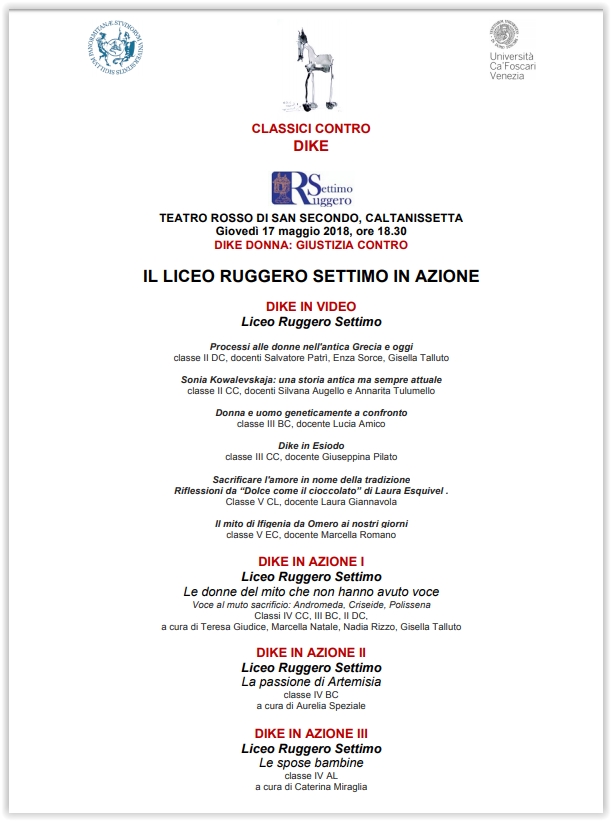 È un’azione che si svolge nei teatri più belli d’Italia e che parte da un tema proveniente dal mondo antico contro la deriva etica, estetica, civica e culturale del nostro universo.Quest’anno la riflessione verterà su “DIKE/ΔΙΚΗ. Ovvero della giustizia tra l'Olimpo e la Terra”. Saremo anche noi a Caltanissetta il 17 maggio 2018 una delle città di Dike (https://virgo.unive.it/flgreca/Dike2018Caltanissetta.htm). Al teatro Rosso di San Secondo partirà un’intensa riflessione alle ore 18:30 alla quale il Liceo Classico, Linguistico e Coreutico “R. Settimo” ha voluto dare un’intonazione particolare, declinando il tema con il sottotitolo “Dike donna: giustizia contro”. Introdurranno e coordineranno l’incontro Marcella Natale (Liceo Ruggero Settimo Caltanissetta) e Andrea Cozzo (Università di Palermo). Dopo un breve saluto della dirigente Irene Cinzia Maria Collerone, sarà proiettato un video realizzato dagli studenti, nel quale si evidenziano tutte le attività didattiche e di riflessione condotte in classe durante l’interno anno scolasticosul tema della giustizia e dell’ingiustizia, soprattutto nei confronti delle donne, nel mondo antico e nella realtà contemporanea. Seguirà un intervento di Anna Beltrametti, docente presso l’Università di Pavia, che approfondirà “La giustizia di Medea”: intervento dal titolo volutamente paradossale, in quanto non il tema della giustizia, ma il tema dell'ingiustizia percorre la tragedia fino al gesto terribile di Medea: l'infanticidio, crimine estremo. Seguirà la prima delle azioni messe in atto nella città di Dike: ascolteremo “Le donne del mito che non hanno avuto voce”. Seguirà Valeria Andò, dell’Università di Palermo con “Giustizia al femminile. O vendetta?”. L’azione successiva “Artemisia Gentileschi” ci condurrà in un tribunale del Seicento. L’ultima relazione sarà di Maria Grazia Vagliasindi, Presidente Corte d’Appello di Caltanissetta, che parlerà di “Antigone e Ismene tra etica e legalità”. Infine Dike entrerà in azione con “Le spose bambine”.