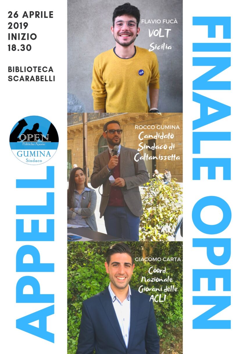 Venerdì 26 aprile, a partire dalle 18.30 presso la biblioteca Scarabelli a Caltanissetta, il movimento “OPEN politiche aperte” concluderà la campagna elettorale con un “Appello finale” in vista del voto per le amministrative nissene del 28 aprile.