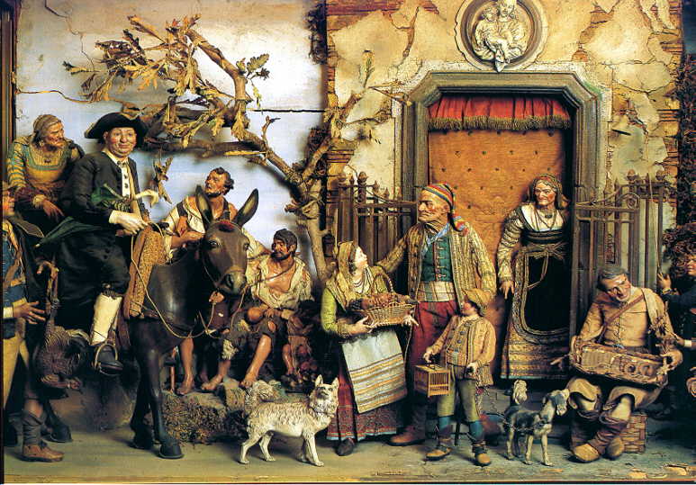 Provenienti dal Museo di San Martino di Napoli, che custodisce i nuclei collezionistici più celebri dell’arte del Presepe napoletano, saranno esposte selezionate figure presepiali dalle scene dell’Annuncio ai pastori e della Taverna, già proposte al pubblico nella prestigiosa sede del Museo della Cattedrale di Cristo Salvatore a Mosca nel 2011. Tra le figure in mostra, tre Angeli dell’Annuncio verosimilmente attribuiti ad Angelo Viva, discepolo di Giuseppe Sammartino, il massimo scultore napoletano del Settecento, autore del celebre Cristo velato della Cappella Sansevero di Napoli; e personaggi eoggetti di taverna, la scena che nei presepi napoletani restituisce appieno il vivido spirito partenopeo, con un'immagine di opulenza e un’atmosfera godereccia, dovizia di cibo sulla tavola, suonatori di chitarra e mandolino, giocatori di carte, osti e ostesse dall’aspetto allegro e dalla pingue corporatura.