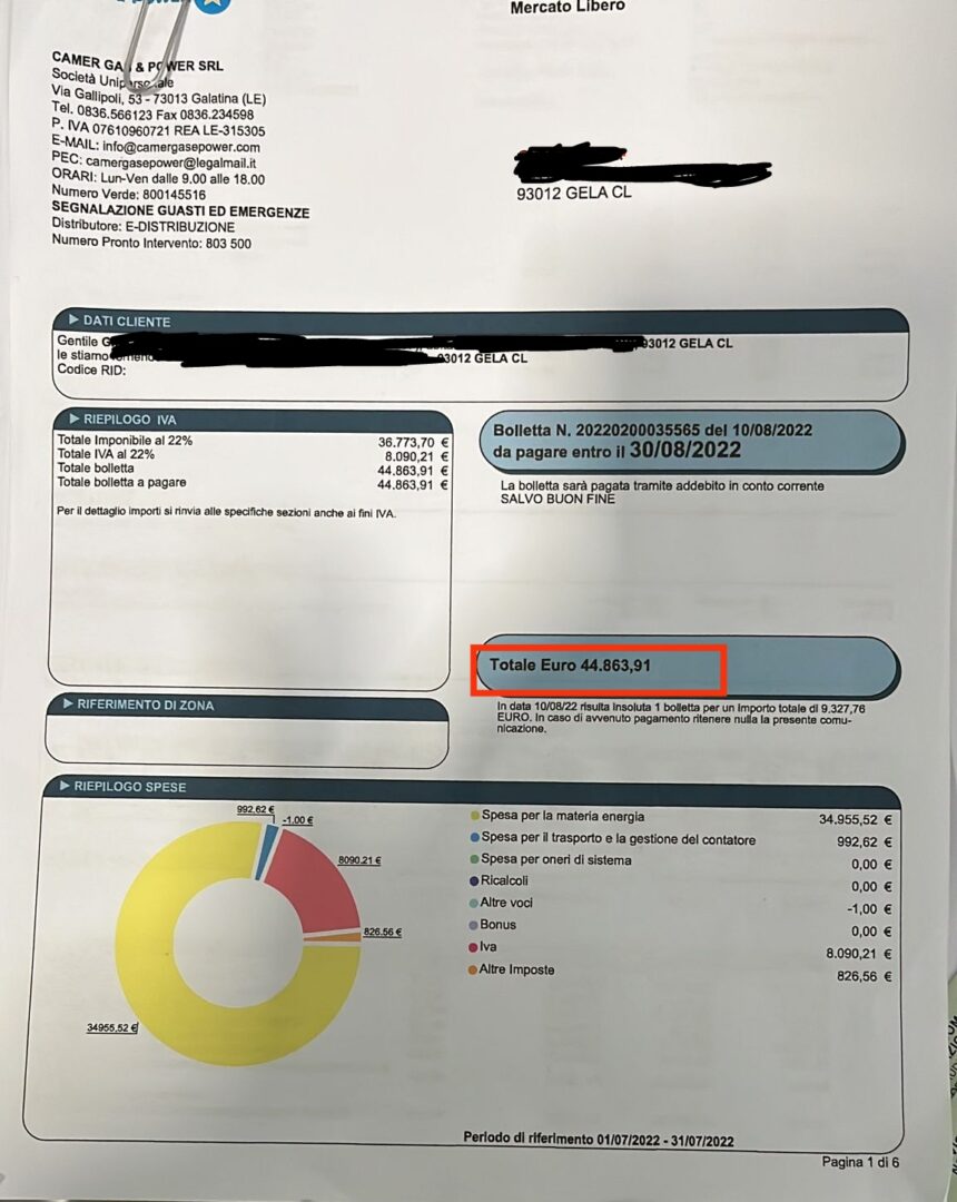 Ad un esercente di Gela è stata recapitata una bolletta da 44 mila euro. Altri esercenti non se la passano meglio avendo ricevuto bollette da 6 mila o 4 mila euro.