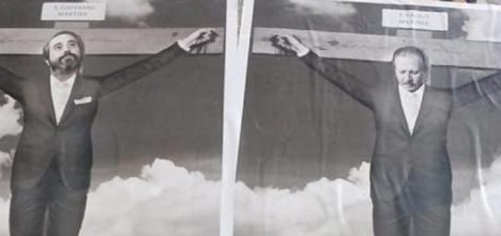 Due manifesti, uno accanto all'altro, che raffigurano i magistrati Giovanni Falcone e Paolo Borsellino in croce sono spuntati stamattina su un muro non distante da piazza Pretoria la sede del consiglio comunale, in salita Santa Caterina a Palermo. In alto nelle due croci c'è scritto San Giovanni Martire e San Paolo Martire. I manifesti portano la firma Al Fayeth. Non si sa chi sia l'autore dei manifesti e chi li abbia attaccati al muro.