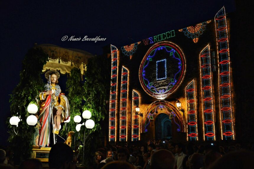 Il comitato dei festeggiamenti già al lavoro preparerà il fercolo, ornarto di basilico come da tradizione cui seguirà l'uscita trionfale dal portone centrale della chiesa madre per iniziare la solenne processione a lui dedicata intonando l’ “inno al glorioso Rocco”, mentre le campane suoneranno a festa sentendo vicino lo stesso san Rocco. Dopo averlo sistemato sul fercolo, inizierà la processione serale che riporterà la sacra effigie di San Rocco nel santuario a lui dedicato.