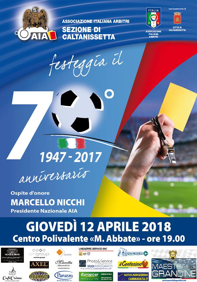 Si svolgerà giovedì 12 Aprile, a partire dalle 19, al centro polivalente "Michele Abbate", la manifestazione voluta dal presidente provinciale Domenico Amico, per festeggiare i primi 70 anni di attività della sezione AIA di Caltanissetta, fondata nel 1947 da Eugenio Calcagno. Durante la serata verranno ricordati i tanti successi ottenuti negli anni dalle varie gestioni susseguitesi e le tante gioie conseguite. Un ricordo speciale per gli atleti che si sono contraddistinti per la loro competenza e tenacia, doti che hanno permesso loro di presentarsi alla ribalta Nazionale. Diversi sono stati infatti i fischietti che hanno esordito in categorie prestigiose come la serie C ed assistenti di linea, i famosi guardalinee, che sono stati designati anche in campo europeo nella importantissima “Champions League”. Infine nel corso della serata verranno premiati i giovani arbitri che si sono contraddistinti nell’ultima stagione e che rappresentano il futuro della gloriosa sezione AIA di Caltanissetta, interverrà il presidente Nazionale il Sig. Nicchi.