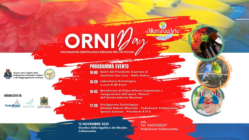 FederEventi Caltanissetta, il Comitato di quartiere di San Luca, BS event, sotto l'egidia della Federazione Ornicoltori Italiani – FOI e del Raggruppamento Ornitologico Siciliano in collaborazione attiva con l'Associazione Pescarese Ornicoltori, organizza un evento per i più piccoli e le loro famiglie dedicato all'ornicoltura. L'evento si terrà domenica 12 novembre, dalle ore 16:00 alle ore 18:00, presso il Giardino della Legalità e dei Murales nel quartiere San Luca, a Caltanissetta.