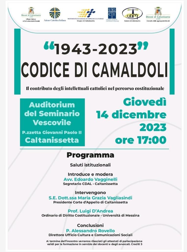 Giovedì 14 dicembre presso l’aula magna del Seminario vescovile si svolgerà un interessante convegno dal titolo 1943 – 2023 Codice di Camaldoli. Il contributo degli intellettuali cattolici nel percorso costituzionale. L’evento, pensato e programmato dalla consulta per le aggregazioni laicali è stato organizzato dalla Azione Cattolica e Movimento ecclesiale di impegno culturale, dai Giuristi cattolici e dall’Uciim.