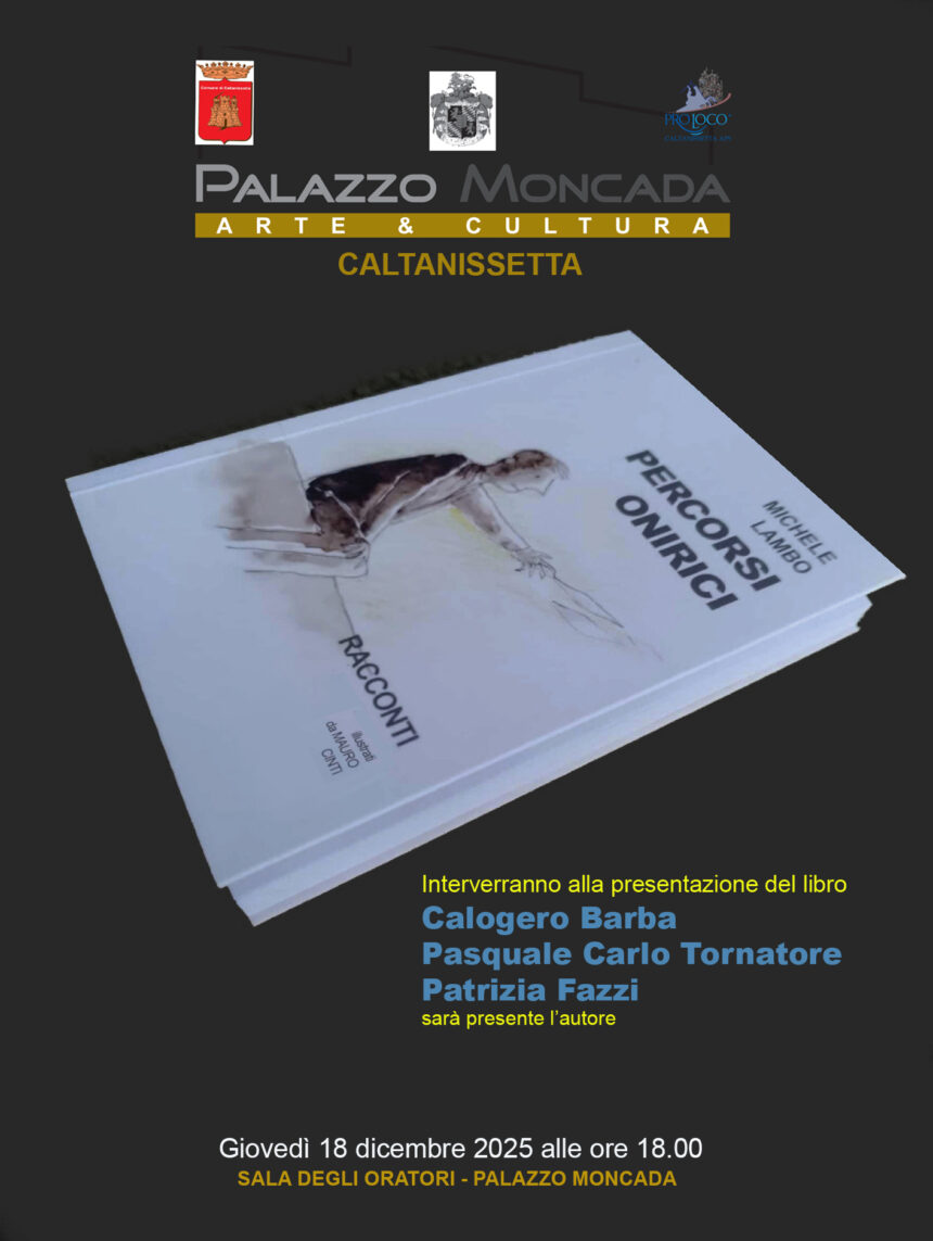 Giovedì 18 dicembre alle 18, nella sala degli oratori di Palazzo Moncada, si terrà la presentazione del libro “Percorsi onirici” di Michele Lambo. Nell’intreccio degli otto racconti immaginari, corpo di questa raccolta, nati da memorie reali ed esperienze interiori, si susseguono storie ambientate in luoghi sospesi nel tempo, dove scompare il confine tra realtà, percezione e sogno. Personaggi, differenti per vissuto e destino, sono accomunati da una medesima istanza: una chiamata silenziosa a prendere responsabilità verso se stessi. Attraversando ostacoli, ciascun protagonista si troverà a compiere un salto di coscienza nell’affrontare la strada del cambiamento. Voci guida, prevalentemente interiori, talvolta incarnate da incontri inattesi, li accompagnano lungo esperienze anche surreali, verso una nuova consapevolezza di sé e del mondo.