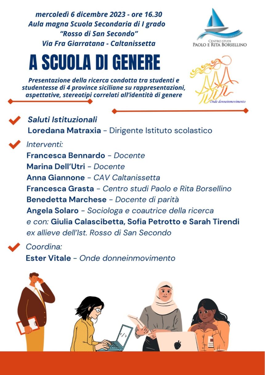 L’Associazione Onde donneinmovimento di Caltanissetta e il Centro Studi Paolo e Rita Borsellino di Palermo, presentano i risultati dell’indagine condotta dalla sociologa Angela Solaro e dal dott. Giuseppe Pillera dell’Università di Catania in quattro province siciliane (Caltanissetta, Catania, Palermo, Siracusa) il prossimo 6 dicembre con inizio alle ore 16.30, presso la scuola media Rosso di San Secondo.