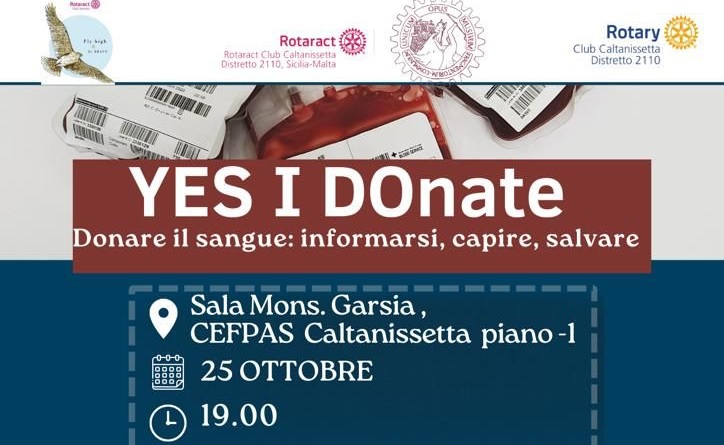 "Yes I donate. Donare il sangue: informarsi, capire, salvare". E' questo il titolo della conferenza organizzata dal Rotaract di Caltanissetta, per sensibilizzare la cittadinanza sul tema della donazione del sangue, che si terrà mercoledì 25 ottobre alle 19 nella sala Mons. Garsia del Cefpas. Dopo i saluti del presidente del Rotaract Club Ruben Gravante e del presidente del Rotary Club Giuseppe Sagone, sono previsti gli interventi del direttore dell'Unità Operativa Complessa di Medicina Trasfusionale, Nunzio Marletta, il direttore medico del distretto ospedaliero Area Nord di Caltanissetta, Benedetto Trobia, il presidente della Croce Rossa di Caltanissetta, Nicolò Piave, il responsabile Avis di Caltanissetta Gaetano Giambusso, il responsabile del progetto nazionale "Raccogliamo speranza", Filippo Chiantia. L'evento sarà moderato da Chiara Curcuruto, presidente commissione sanità del Rotaract Caltanissetta.