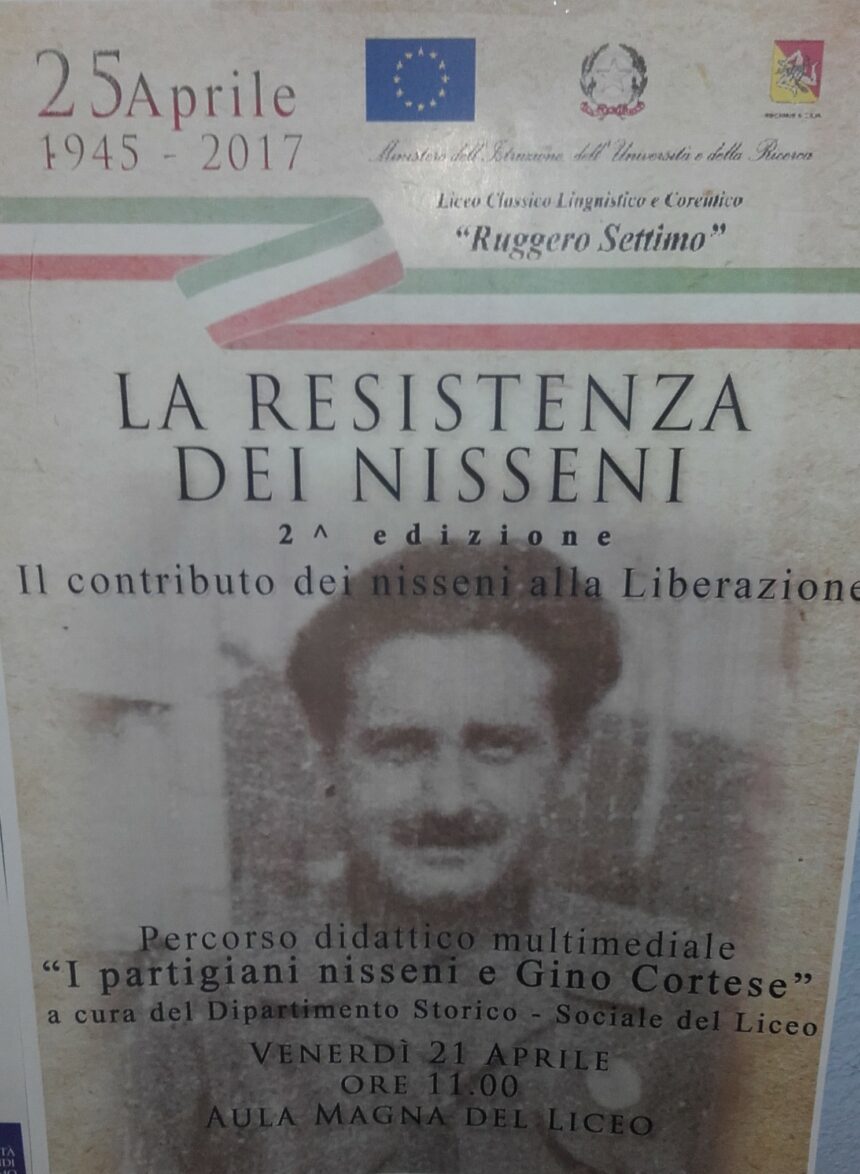Venerdì 21 aprile al Liceo Classico, Linguistico e Coreutico "Ruggero Settimo" dalle ore 11 alle 13.30 in Aula Magna si svolgerà la manifestazione dal titolo "La Resistenza dei nisseni – i partigiani nisseni e Gino Cortese" con la quale la scuola celebra l'anniversario della Liberazione a cura del Dipartimento di Storia e Filosofia.