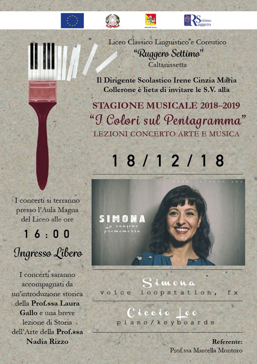 Si terrà martedì 18 dicembre 2018 alle ore 16:00 il primo concerto della stagione musicale "I Colori sul Pentagramma", nell'aula magna del Liceo Classico, Linguistico e Coreutico "R. Settimo". Sul palco SIMONA & Ciccio Leo, che proporranno sonorità jazz e soul.