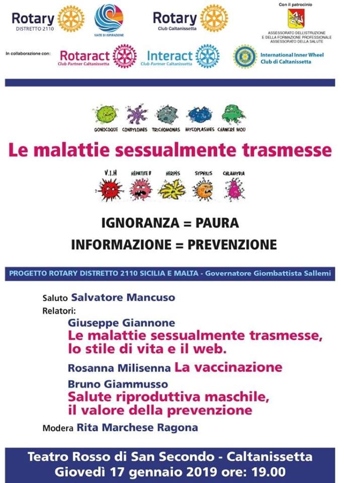 Si terrà giovedì 17 gennaio alle 19, al teatro Rosso di San Secondo, il convegno, organizzato dal Rotary su "Le malattie sessualmente trasmesse". Dopo il saluto di Salvatore Mancuso, interverranno Giuseppe Giannone su "Le malattie sessualmente trasmesse, lo stile di vita, il web", Rosanna Milisenna su "La vaccinazione", Bruno Giammusso su "La salute riproduttiva maschile, il valore della prevenzione". A moderare l'incontro Rita Marchese Ragona.