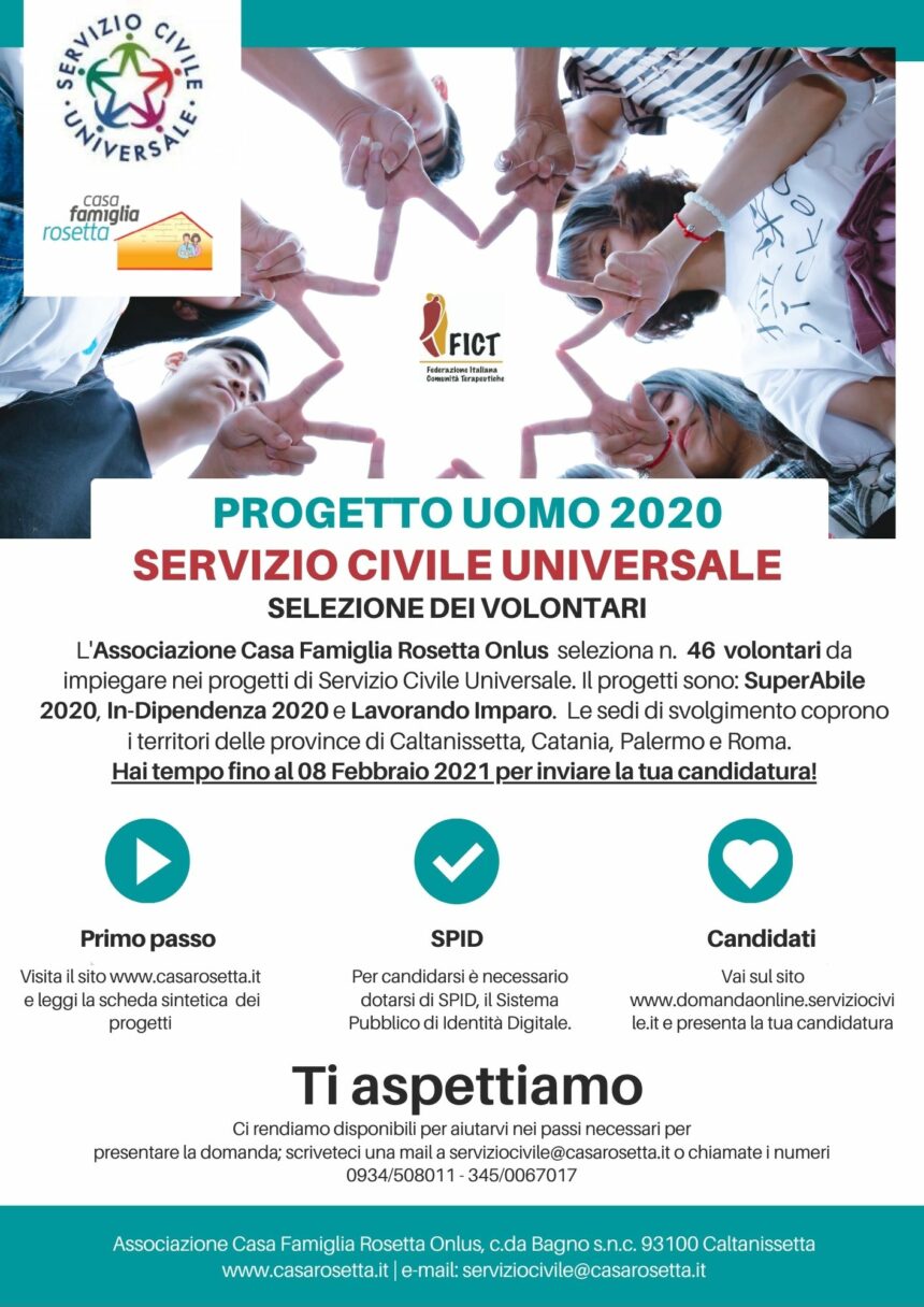Tre progetti di Casa Rosetta approvati dalla Presidenza del Consiglio prevedono quest’anno l’impiego di 46 giovani volontari (età 18-28 anni) nelle strutture dell’associazione nelle province di Caltanissetta, Palermo, Catania, Roma, in attività previste dal “servizio civile universale”. La selezione avverrà tra i candidati che presenteranno domanda entro l’8 febbraio con le modalità previste dal bando consultabile sul sito dell’associazione.