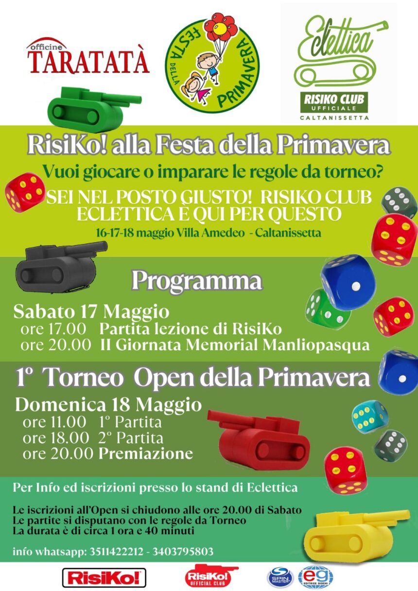 Alla 2a edizione della Festa di Primavera, che si svolge in questo fine settimana presso la Villa Amedeo, il Risiko Club Eclettica di Caltanissetta è presente con un suo stand e con l’organizzazione di eventi legati al mondo del Risiko!: sabato dalle ore 17.00 lezioni di Risiko! da torneo, dalle ore 20.00 II° turno del Memorial Manliopasqua, torneo riservato ai soci del Club in ricordo di Manlio Pasqualino, presidente del RCU Eclettica scomparso recentemente.