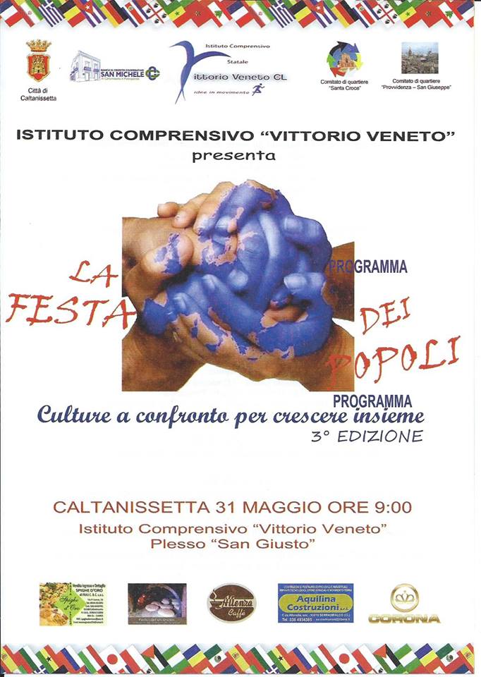 L'istituto comprensivo "Vittorio Veneto" organizza la III edizione della "Festa dei Popoli", culture a confronto per crescere insieme. Integrazione, tolleranza, rispetto, solidarietà caratterizzano la nostra scuola. Più di 200 bambini stranieri di diverse nazionalità che insieme ai bambini italiani ogni giorno crescono nel rispetto e nella conoscenza l'uno degli altri, usi, costumi, tradizioni che troveranno il loro apice da mostrare a tutti nella 3^ edizione della "Festa dei Popoli" a San Giusto il 31 maggio 2017. Questo il programma della manifestazione, che ha visto il contributo di diversi sponsor tra cui l'immancabile Corona: alle 9 l'accoglienza delle autorità da parte dei bimbi della San Giusto e il saluto del dirigente scolastico; dalle 9.30 alle 13 le esibizioni dei bimbi della scuola d'Infanzia e Primaria; alle 15 prenderanno il via le visite guidate ai quartieri Provvidenza e Santa Croce, con la collaborazione dei componenti dei comitati di quartiere; alle 17 tavola rotonda sul tema "Il cibo che unisce" con gli interventi di Cinzia Militello, architetto, Lillo De Fraia, maestro pasticcere, Maria Cristina Cucugliato, dietista Asp di Caltanissetta, Massimo Primavera, direttore Coldiretti Caltanissetta.; seguiranno giochi sportivi a cura della referente Coni Luana Maria Balocchi; per finire alle 19 si aprirà il concorso sulle specialità dolciarie curato dal maestro Lillo De Fraia, la giuria sarà composta dallo stesso Lillo De Fraia e dai presidenti dei comitati di quartiere Provvidenza e Santa Croce, Carmen Frau e Giacomo Tuccio.
