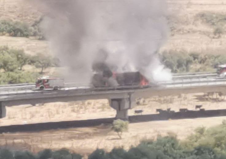 Un mezzo pesante, per cause ancora in corso di accertamento, ha preso fuoco intorno alle 14.30 mentre percorreva la Ss626 Caltanissetta-Gela, al km 7, all'altezza di contrada Capodarso. A quanto pare il conducente sarebbe riuscito a mettersi in salvo dopo essersi accorto delle fiamme che uscivano dal mezzo. Si tratta di un autoarticolato con cella frigorifera che stava trasportando bibite e liquidi in contenitori di plastica. Per questo motivo si è sollevata una densa nube di fumo visibile a diversi chilometri dal luogo dell'incidente. Sul posto due mezzi dei vigili del fuoco di Caltanissetta e un ulteriore mezzo inviato da Enna. Il tir è rimasto quasi interamente distrutto dalle fiamme. (Foto Seguo News)