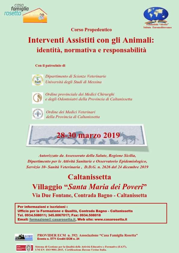 Giunto alla sua II Edizione, da giovedì 28 marzo 2019 a sabato 30, si svolgerà presso la sede dell’Associazione “Casa Famiglia Rosetta, il corso propedeutico dal titolo “Interventi Assistiti con gli Animali: identità, normativa e responsabilità”, con il patrocinio del Dipartimento di Scienze Veterinarie dell’Università degli Studi di Messina, dell’Ordine provinciale dei Medici Chirurghi e degli Odontoiatri della Provincia di Caltanissetta e dell’Ordine dei Medici Veterinari della Provincia di Caltanissetta.