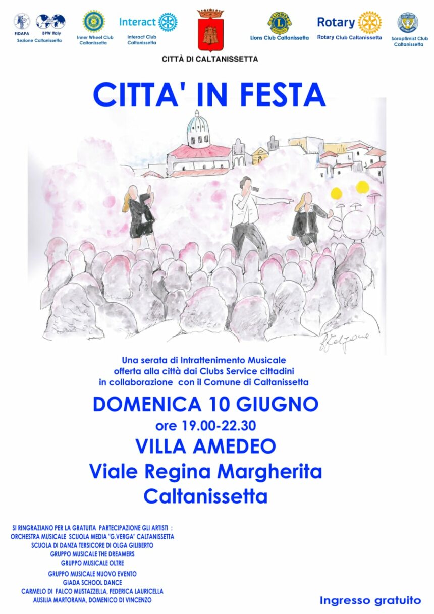 Domenica 10 giugno si svolgerà a partire dalle 19 a villa Amedeo la manifestazione "Città in festa", organizzata dai Club service cittadini con il patrocinio del Comune di Caltanissetta. L'iniziativa ha lo scopo di offrire alla città una serata di intrattenimento musicale con artisti nisseni all'insegna della spensieratezza. Presenteranno Donatello Polizzi e Maria Grazia Pignataro. Nella locandina il disegno realizzato dalla pittrice Livia Falzone.