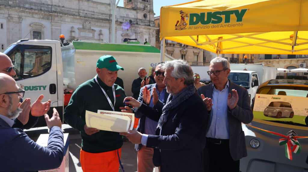 Oltre alla consegna ufficiale del primo premio, un ulteriore e inatteso momento si è aggiunto alla cerimonia di rito. Il Sindaco, infatti, di concerto con il dirigente della sezione II del Comune, Ing. Giuseppe Tomasella, ha conferito un encomio a Luca Macaluso, operatore ecologico Dusty che, insieme a tanti altri colleghi, contribuisce con grande dedizione a mantenere pulite le strade della città.