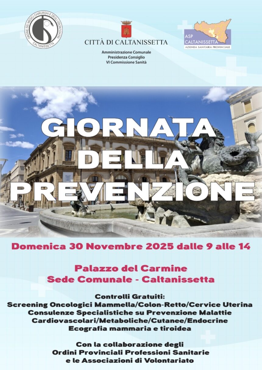 Ultima chiamata per la “Giornata di Prevenzione” nissena. Tra poche ore infatti la Casa Comunale ospiterà l'evento promosso dall'Asp di Caltanissetta e Ordine dei Medici Chirurghi e Odontoiatri della Provincia e organizzato in città dall'Amministrazione Comunale, Presidenza del Consiglio Comunale e dalla VI Commissione “Sanità”. Al centro la salute dei cittadini attraverso la prevenzione, ad accoglierli, tra le ore 9 e le 14 di domenica 30 novembre 2025, ci sarano non soltanto medici, ma anche operatori sanitari e volontari visto il coinvolgimento di diversi Ordini Professionali che operano nell'ambito sanitario e Associazioni di Volontariato. Oltre agli screening oncologici alla mammella, colon-retto e cervice uterina, verranno effettuate gratuitamente consulenze specialistiche per la prevenzione di malattie metaboliche, cardiovascolari, cutanee e tiroidee.