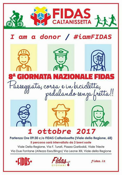 Passeggiate, corse e bici. Si festeggerà così a Caltanissetta l'VIII Giornata Nazionale Fidas, l'associazione sempre in prima linea nelle donazioni di sangue. L'appuntamento è per domenica mattina alle 9.30 presso la sede della Fidas di viale della Regione. Chiunque potrà unirsi scegliendo di camminare, andare in bici o correre nel percorso che passerà per via Turati, piazza Garibaldi, viale Trieste, via Due Fontane, via Leone XIII e che si concluderà nuovamente in viale della Regione. Il percorso sarà intervallato da tre brevi soste. La cittadinanza è invitata a partecipare.