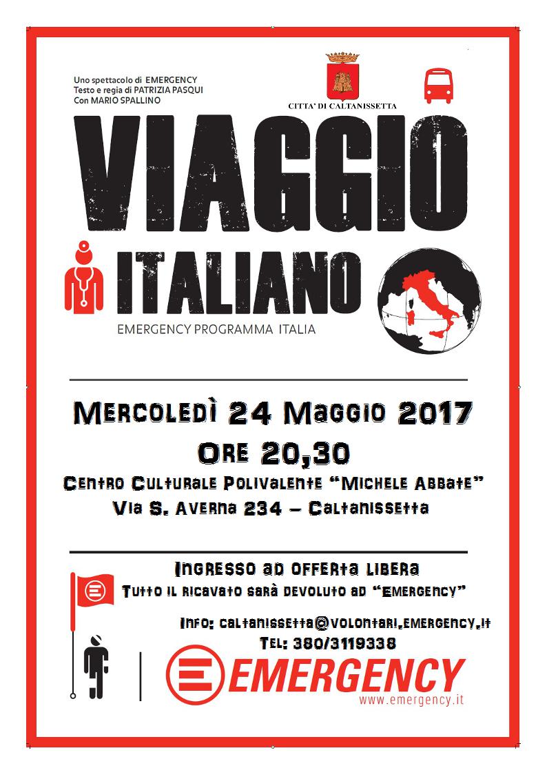 "Viaggio italiano" è il titolo dello spettacolo teatrale che andrà in scena al centro "Michele Abbate" il 24 maggio alle 20.30 organizzato dal gruppo volontari Emergency di Caltanissetta. Lo spettacolo ha avuto il Patrocinio del Comune di Caltanissetta.